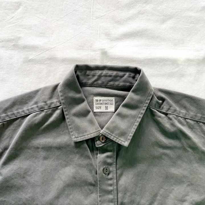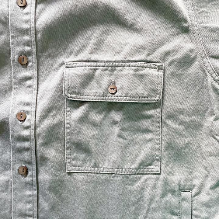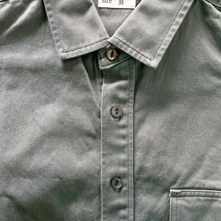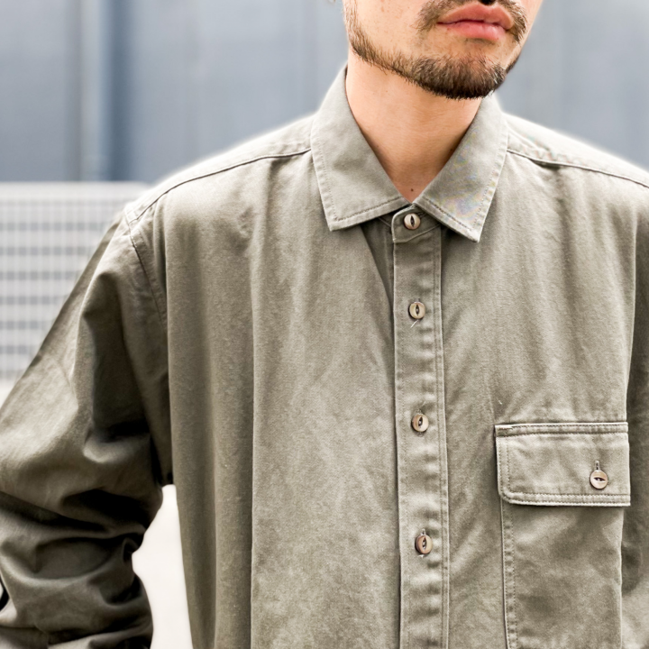 ボタンもカラーに合わせた配色の猫目ボタンを採用することで、MILITARY SHIRT のような要素も意識したデザインになっております。