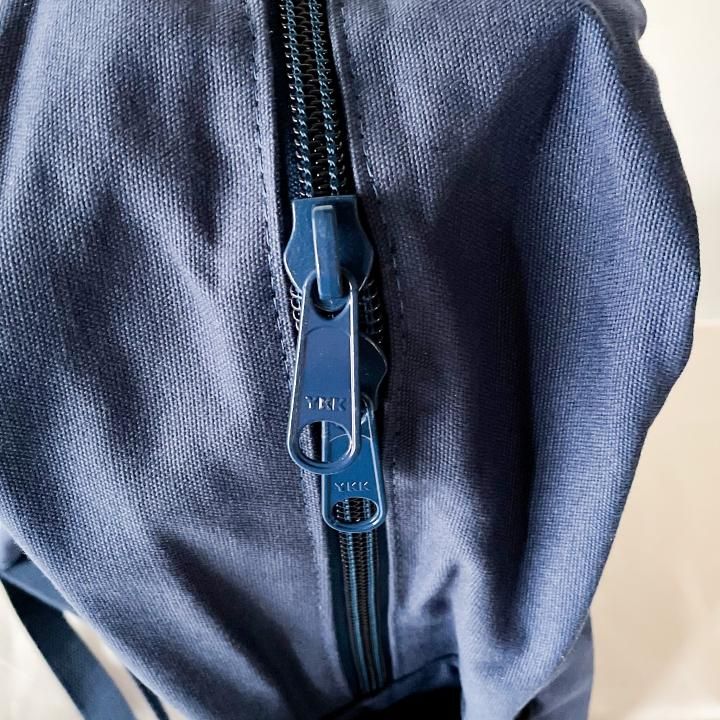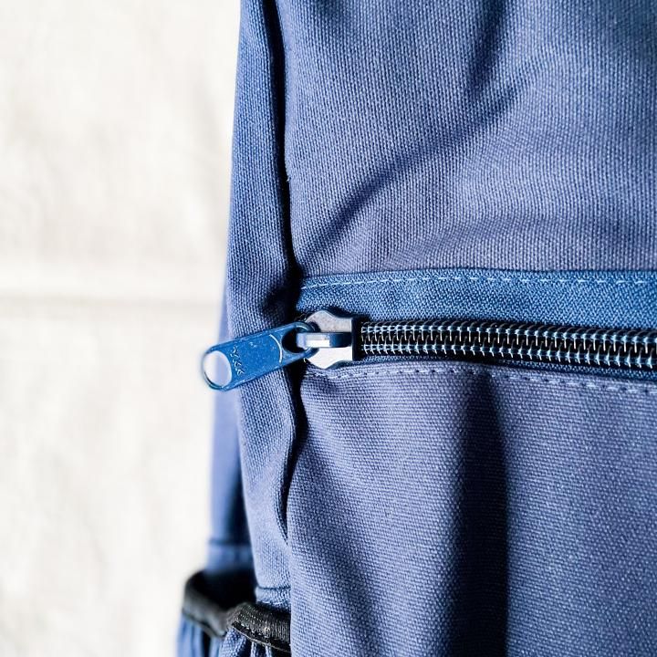 フロントには生地に合わせた配色の ZIP を使用したポケットを配しており、シンプルな印象を与えるデザインに。