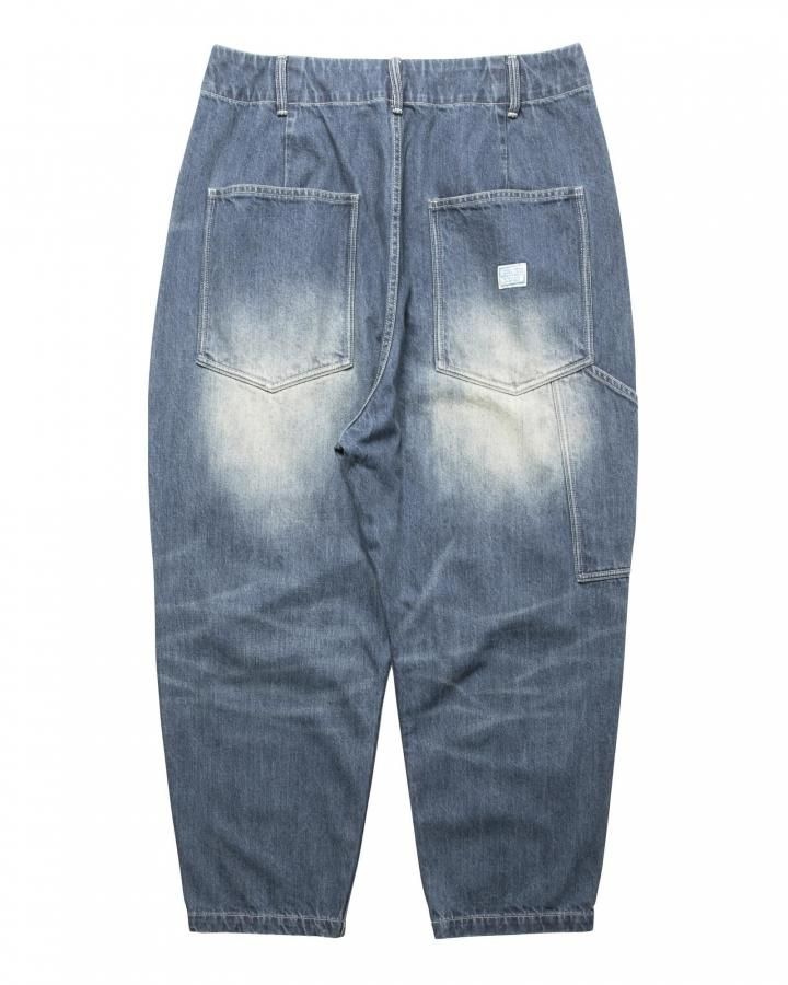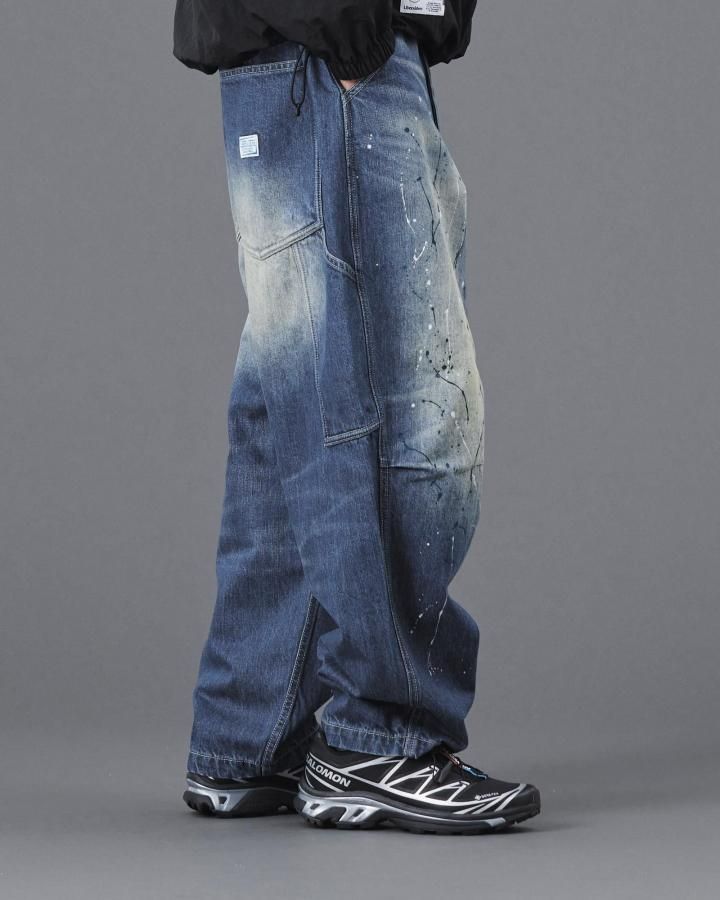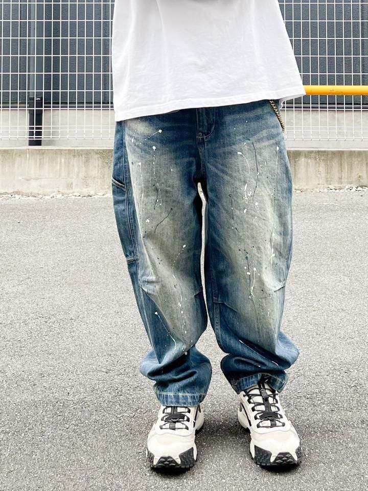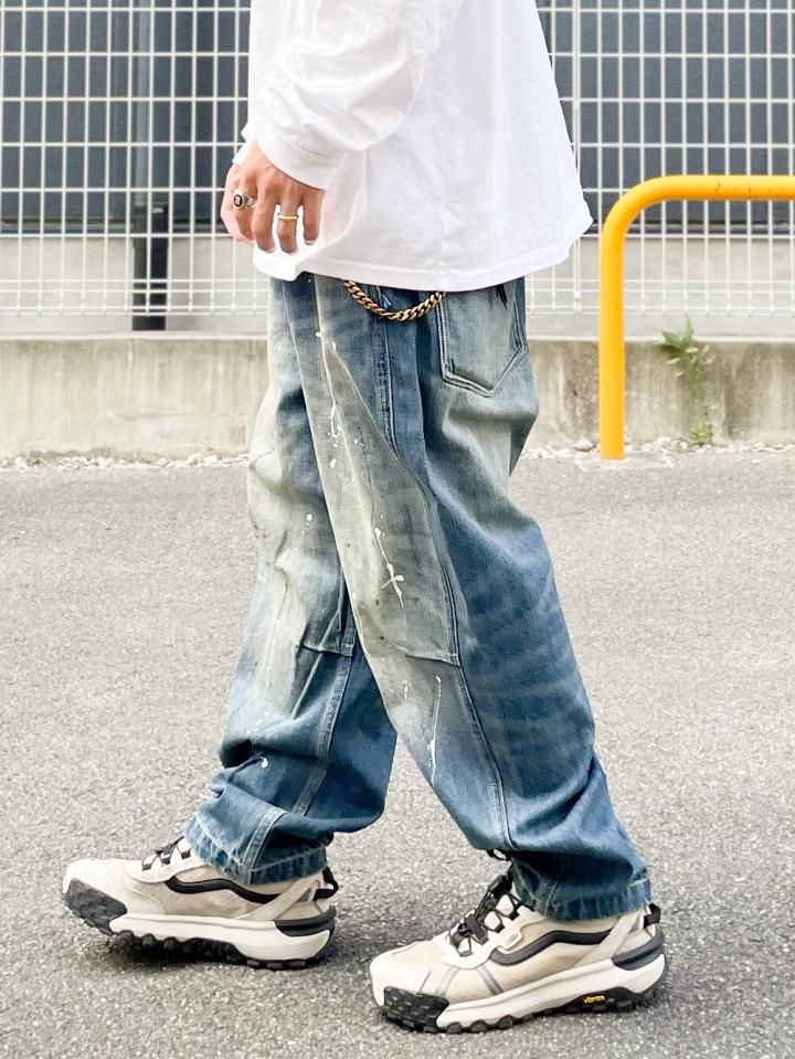 丁寧に施されたヴィンテージ加工が特徴的な、11.5oz のデニムを使用したサルエルデニムパンツ。
