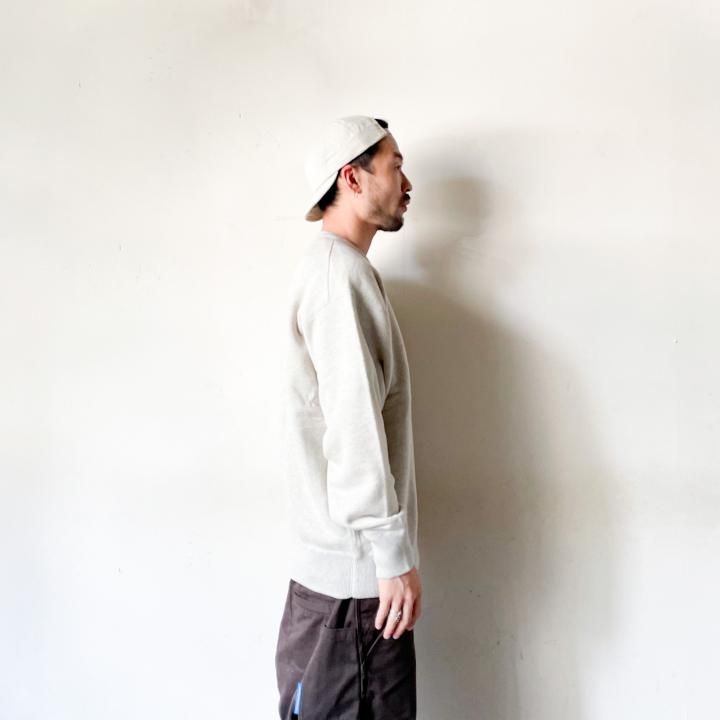 身幅や肩周りにゆとりを取ったデザインのため、ゆったりとしたシルエットが生まれつつも、しっかりとしたリブを用いることで、カジュアルな印象を与えながらも清潔感を持ったルックスに仕上がった CREW NECK PULLOVER 。