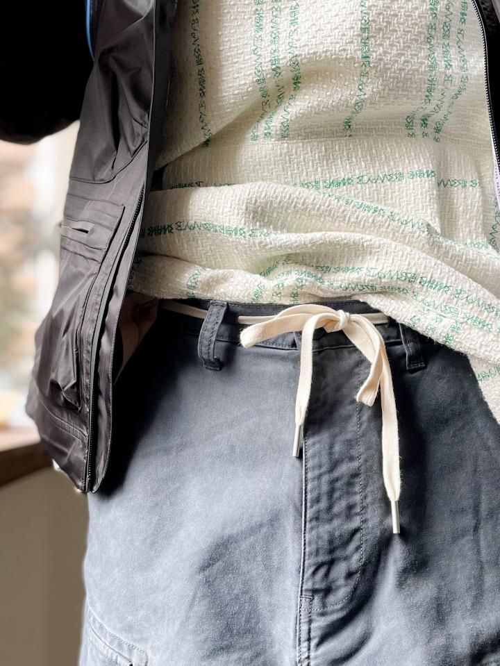 ややゆったりとしたカーゴシルエットをベースに、ウェストにはシューレースベルトを配置。